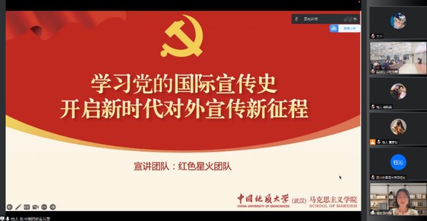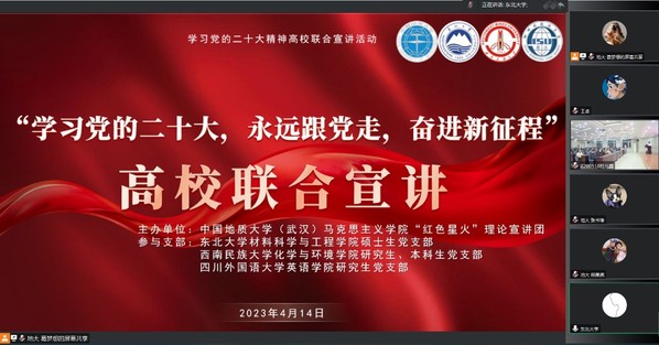 本次活动由中国地质大学“红色星火”理论宣讲团成员杜汶君主持。活动伊始,李刚、郭惠、四川外国语大学英语学院研究生学生第七党支部书记周钰沁和中国地质大学“红色星火”理论宣讲团成员张书缘,通过讲述ppt的形式带领同学们一起学习了党的二十大精神的丰富内涵和时代意义,并表示,希望同学们认真学习贯彻党的二十大精神,切实把思想和行动统一到党的二十大精神上来。随后,四所学校的同学们展开了热烈的讨论和交流,大家纷纷表示,作为新时代青年学生,应该认真学习党的二十大精神,紧密团结在以习近平同志为核心的党中央周围,坚定不移地走中国特色社会主义道路,努力成为有理想、敢担当、能吃苦、肯奋斗的新时代好青年。