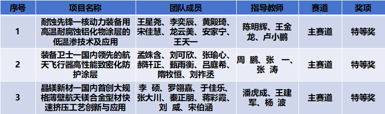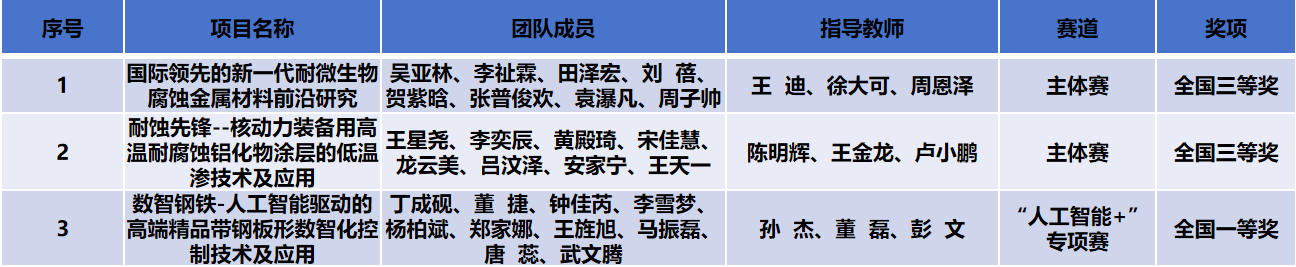 由我院徐大可、王迪、周恩泽老师指导,吴亚林等申报的作品《国际领先的新一代耐微生物腐蚀金属材料前沿研究》在“主体赛”中获得国家级三等奖;陈明辉、王金龙、卢小鹏老师指导,王星尧等申报的作品《耐蚀先锋--核动力装备用高温耐腐蚀铝化物涂层的低温渗技术及应用》在“主体赛”中获得国家级三等奖。由数字钢铁全国重点实验室孙杰、董磊、彭文老师指导,丁成砚等申报的作品《数智钢铁-人工智能驱动的高端精品带钢板形数智化控制技术及应用》在“人工智能+”专项赛中中获得国家级一等奖。
